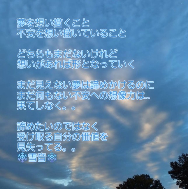 自分の叶えたい夢があるのに 自分には無理だと思って諦めてしまう すごく不安に思うと まだ現実になっていないことも想像して 落ち込んでいく。。 現実としてあるかのように… 不安の裏側を見るのはとても。。怖い 夢に追い付けない自分の今を 見つめてしま... -